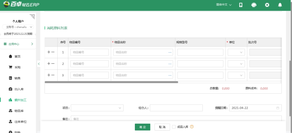 在需要進(jìn)行生產(chǎn)時(shí),創(chuàng)建委外加工單,單據(jù)內(nèi)會(huì)記錄委外加工時(shí)需要消耗的原材料及數(shù)量成本、生產(chǎn)出的成品及數(shù)量、加工費(fèi)用,最終成品單位成本。