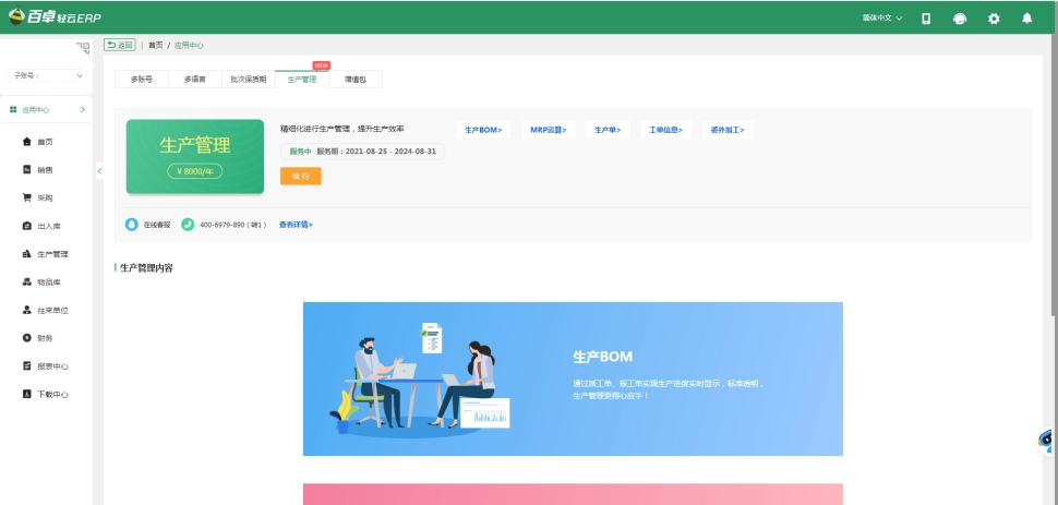 百卓輕云ERP的委外加工為生產(chǎn)管理模塊之一,咨詢(xún)專(zhuān)線(xiàn):18402578025 或 400-6979-890(轉(zhuǎn)1)。提供增值稅普通發(fā)票,稅點(diǎn)6%。